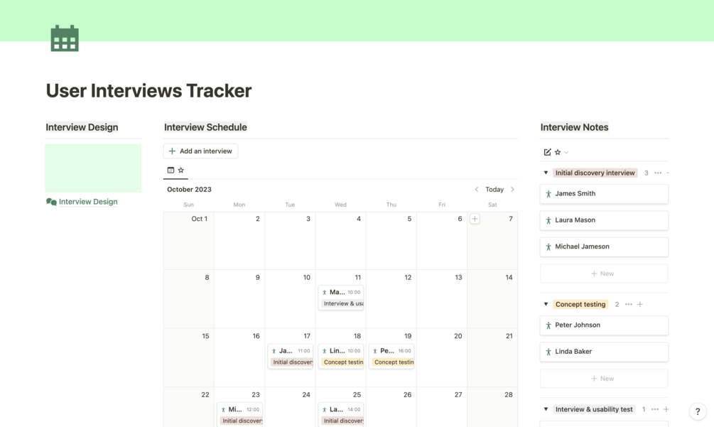 ✔︎ User interviews tracker template: a space to schedule, track, and analyze different types of user interviews.