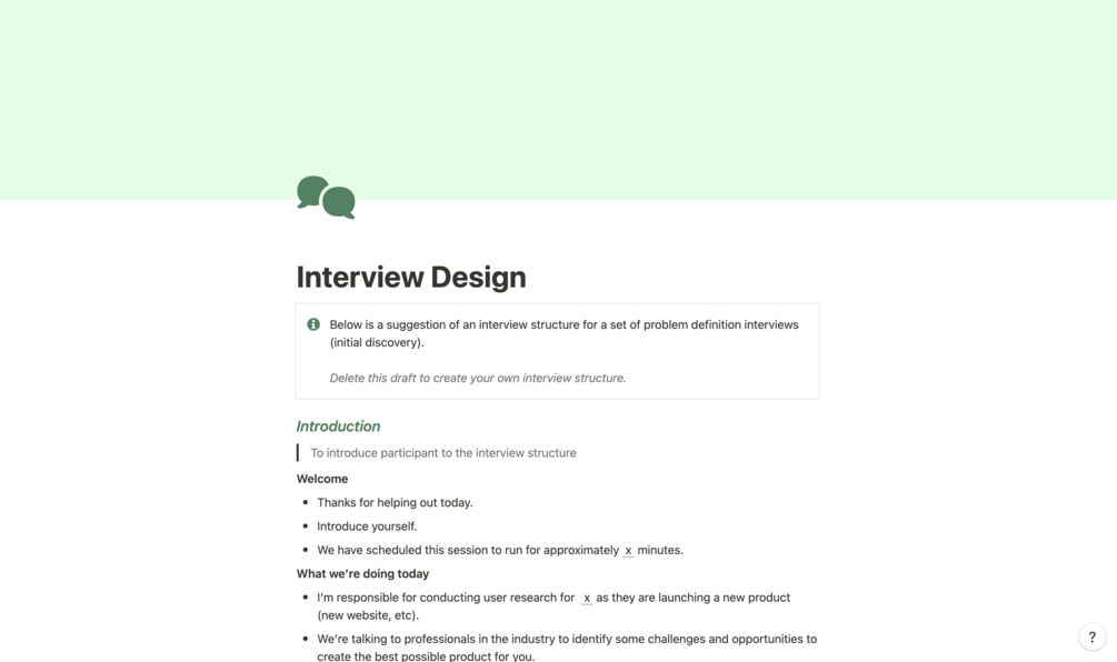 This Notion template is designed for user researchers who plan and conduct different types of interviews with users (user interviews, usability testing, concept testing, evaluative interviews, etc).